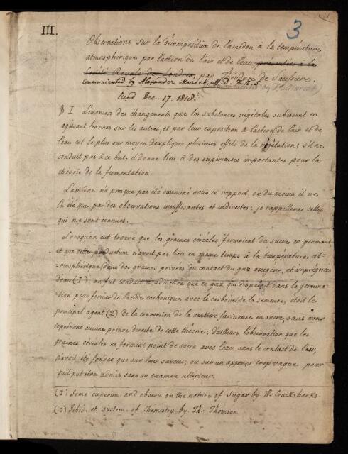 Nicolas Theodore de Saussure, Paper, 'Observations sur la décomposition de l'amidon à la température atmosphérique par l'action de l'air et de l'eau' by [Nicolas] Theodore de Saussure, 07 October 1818, PT/13/3, The Royal Society Archives, London, https://makingscience.royalsociety.org/items/pt_13_3/paper-observations-sur-la-décomposition-de-lamidon-à-la-température-atmosphérique-par-laction-de-lair-et-de-leau-by-nicolas-theodore-de-saussure, accessed on 08 December 2025