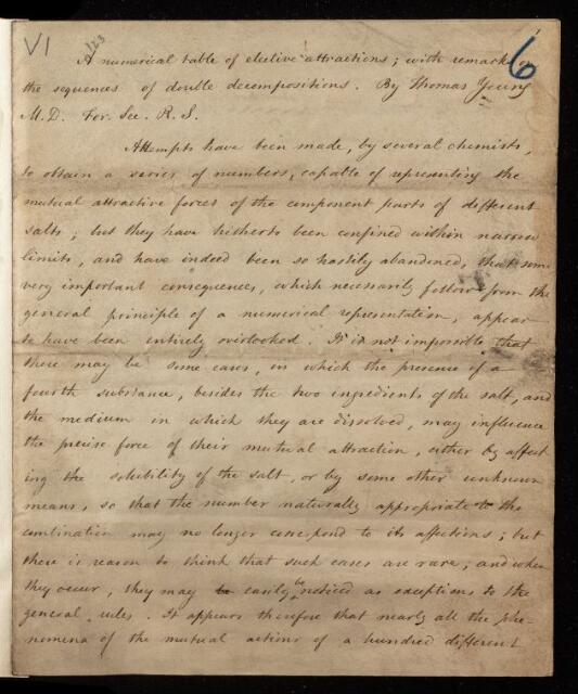 Thomas Young, Paper, 'A numerical table of elective attractions; with remarks on sequences of double decompositions' by Thomas Young, 1809, PT/3/6, The Royal Society Archives, London, https://makingscience.royalsociety.org/items/pt_3_6/paper-a-numerical-table-of-elective-attractions-with-remarks-on-sequences-of-double-decompositions-by-thomas-young, accessed on 14 January 2026