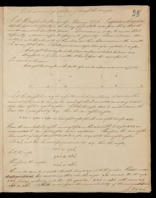 Unpublished paper, 'On the nature and properties of straight lined angles' by J [John] Walsh, 15 January 1825, AP/11/23, The Royal Society Archives, London, https://makingscience.royalsociety.org/items/ap_11_23/unpublished-paper-on-the-nature-and-properties-of-straight-lined-angles-by-j-john-walsh, accessed on 07 November 2025
