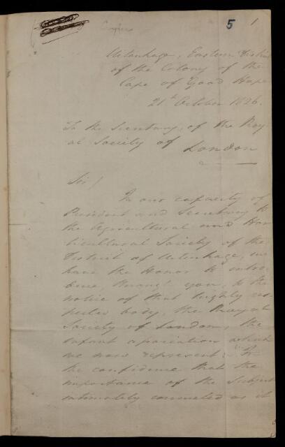 Unpublished paper and letter, regarding the Agricultural and Horticultural Society in the Cape of Good Hope from J G [Jacob Glen] Cuyler and Edwin C [Cheere] Emett, 21 October 1826, AP/12/5, The Royal Society Archives, London, https://makingscience.royalsociety.org/items/ap_12_5/unpublished-paper-and-letter-regarding-the-agricultural-and-horticultural-society-in-the-cape-of-good-hope-from-j-g-jacob-glen-cuyler-and-edwin-c-cheere-emett, accessed on 15 January 2026