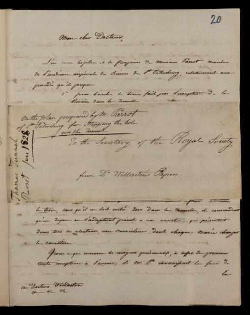 Marc Isambard Brunel, Unpublished paper and letter, 'Observations on the plan proposed by Mr Parrot of St Petersbourg [Petersburg] for mending the hole over the tunnel, securing the works against future irruption [upsurges] and in case of any irruption [upsurge], for saving the men' by Mc I [Marc Isambard] Brunel, 16 June 1828, AP/13/20, The Royal Society Archives, London, https://makingscience.royalsociety.org/items/ap_13_20/unpublished-paper-and-letter-observations-on-the-plan-proposed-by-mr-parrot-of-st-petersbourg-petersburg-for-mending-the-hole-over-the-tunnel-securing-the-works-against-future-irruption-upsurges-and-in-case-of-any-irruption-upsurge-for-saving-the-men-by-mc-i-marc-isambard-brunel, accessed on 19 April 2026