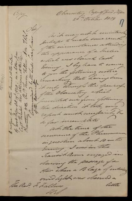 Fearon Fallows, Unpublished copy letters, regarding notice of a meteor from W [William] Ronald and Fearon Fallows, October-November 1829, AP/14/17, The Royal Society Archives, London, https://makingscience.royalsociety.org/items/ap_14_17/unpublished-copy-letters-regarding-notice-of-a-meteor-from-w-william-ronald-and-fearon-fallows, accessed on 07 November 2025