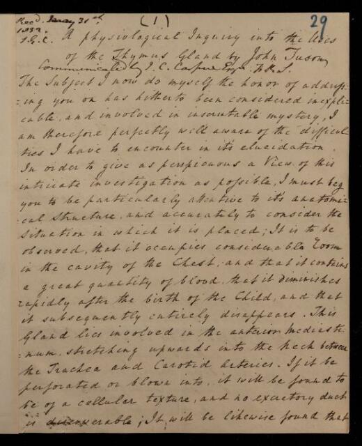 Unpublished paper, 'A physiological inquiry into the uses of the thymus gland' by John Tuson, 30 May 1832, AP/15/29, The Royal Society Archives, London, https://makingscience.royalsociety.org/items/ap_15_29/unpublished-paper-a-physiological-inquiry-into-the-uses-of-the-thymus-gland-by-john-tuson, accessed on 08 February 2026