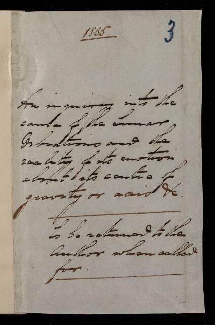 Unpublished paper, 'An inquiry into the cause of the lunar librations and the reality of its motion about its centre of gravity or axis - in which it will appear that this rotary motion of the moon is entirely imaginary and that the librations of the moon have never been explained' by unknown author, 1835, AP/16/3, The Royal Society Archives, London, https://makingscience.royalsociety.org/items/ap_16_3/unpublished-paper-an-inquiry-into-the-cause-of-the-lunar-librations-and-the-reality-of-its-motion-about-its-centre-of-gravity-or-axis-in-which-it-will-appear-that-this-rotary-motion-of-the-moon-is-entirely-imaginary-and-that-the-librations-of-the-moon-have-never-been-explained-by-unknown-author, accessed on 23 January 2026