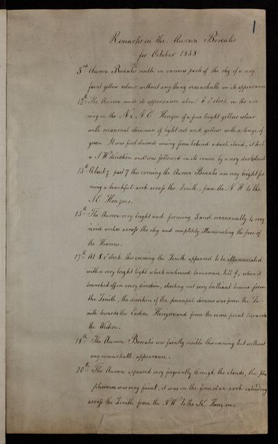 Unpublished paper, 'Remarks on the Aurora Borealis for October 1838' by unknown author
