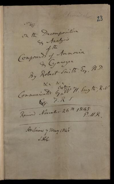 Robert Angus Smith, Unpublished paper, 'On the decomposition and analysis of the compounds of ammonia and cyanogen' by Robert Smith, 24 November 1845, AP/28/23, The Royal Society Archives, London, https://makingscience.royalsociety.org/items/ap_28_23/unpublished-paper-on-the-decomposition-and-analysis-of-the-compounds-of-ammonia-and-cyanogen-by-robert-smith, accessed on 06 February 2026