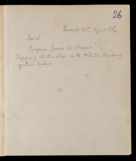 Unpublished paper, 'Second memoir upon the determination of unknown functions that are involved under definite integrals' by Joaquim Gomes de Souza, 25 April 1856, AP/38/26, The Royal Society Archives, London, https://makingscience.royalsociety.org/items/ap_38_26/unpublished-paper-second-memoir-upon-the-determination-of-unknown-functions-that-are-involved-under-definite-integrals-by-joaquim-gomes-de-souza, accessed on 18 January 2026