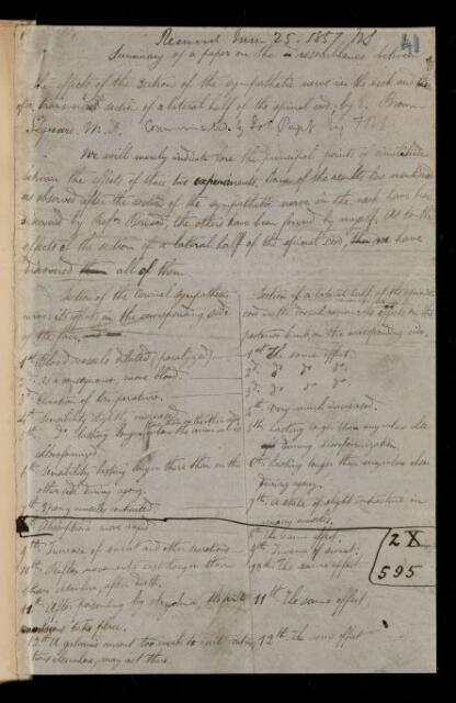 Charles Edward Brown-Sequard, Abstract, 'Summary of a paper on the resemblance between the effects of the section of the sympathetic nerve in the neck and of a transverse section of a lateral half of the spinal cord' by [Charles Edward] Brown-Sequard, 1857, AP/39/41, The Royal Society Archives, London, https://makingscience.royalsociety.org/items/ap_39_41/abstract-summary-of-a-paper-on-the-resemblance-between-the-effects-of-the-section-of-the-sympathetic-nerve-in-the-neck-and-of-a-transverse-section-of-a-lateral-half-of-the-spinal-cord-by-charles-edward-brown-sequard, accessed on 09 December 2025