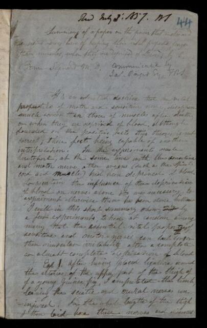 Abstract, 'Summary of a paper on the power possessed by motor and sensitive nerves of retaining their vital properties longer than muscles, when deprived of blood' by [Charles Edward] Brown-Sequard