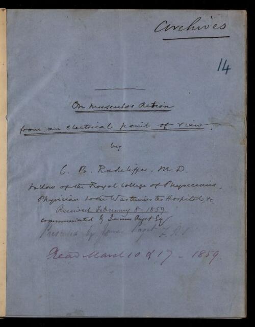 Charles Bland Radcliffe, Unpublished paper, 'On muscular action from an electrical point of view' by C B [Charles Bland] Radcliffe, 1859, AP/42/14, The Royal Society Archives, London, https://makingscience.royalsociety.org/items/ap_42_14/unpublished-paper-on-muscular-action-from-an-electrical-point-of-view-by-c-b-charles-bland-radcliffe, accessed on 16 November 2025