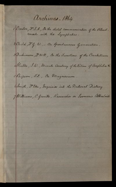 Archived papers: volume 46, scientific papers submitted the Royal Society unpublished or abstracted, 1864, 1864, AP/46, The Royal Society Archives, London, https://makingscience.royalsociety.org/items/ap_46/archived-papers-volume-46-scientific-papers-submitted-the-royal-society-unpublished-or-abstracted-1864, accessed on 25 January 2026