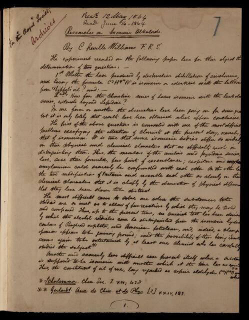 Charles Greville Hanson Williams, Unpublished paper, 'Researches on isomeric alkaloids' by C [Charles] Greville Williams, 1864, AP/46/7, The Royal Society Archives, London, https://makingscience.royalsociety.org/items/ap_46_7/unpublished-paper-researches-on-isomeric-alkaloids-by-c-charles-greville-williams, accessed on 16 November 2025