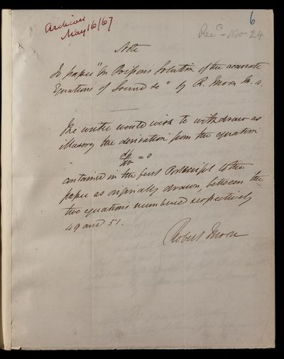The 'Archived Papers' collection is comprised of original manuscript scientific papers and letters submitted to the Royal Society which remained unpublished or were abstracted in the journal 'Proceedings of the Royal Society' published from 1830 onwards.