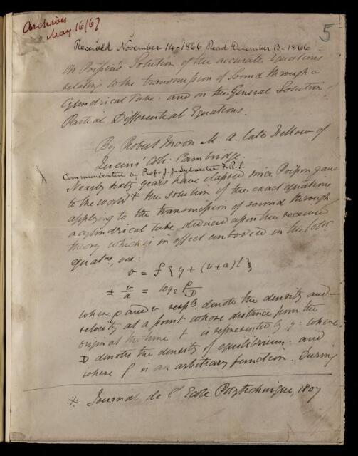 Robert Moon, Unpublished paper, 'On Poisson's solution of the accurate equations relating to the transmission of sound through a cylindrical tube: and the general solution of partial differential equations' by Robert Moon, 1866, AP/48/5, The Royal Society Archives, London, https://makingscience.royalsociety.org/items/ap_48_5/unpublished-paper-on-poissons-solution-of-the-accurate-equations-relating-to-the-transmission-of-sound-through-a-cylindrical-tube-and-the-general-solution-of-partial-differential-equations-by-robert-moon, accessed on 15 February 2026
