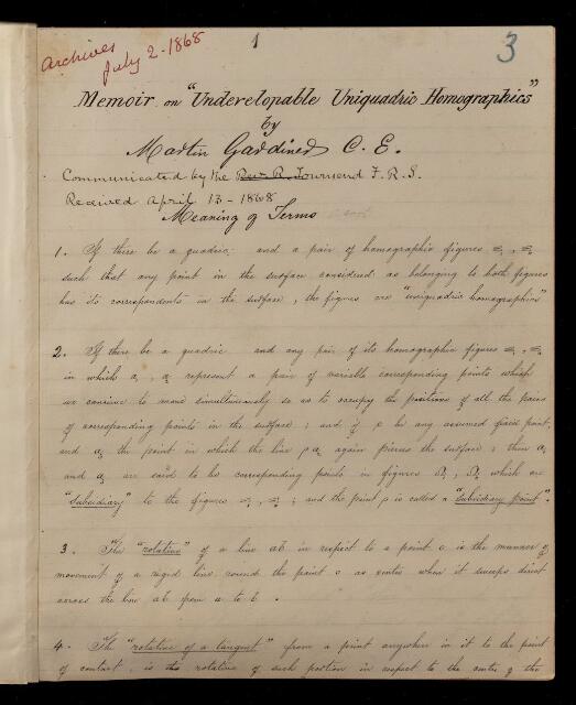 Unpublished paper, 'Memoir on "Undevelopable Uniquadric Homographics"' by Martin Gardiner, 07 June 1867, AP/50/3, The Royal Society Archives, London, https://makingscience.royalsociety.org/items/ap_50_3/unpublished-paper-memoir-on-undevelopable-uniquadric-homographics-by-martin-gardiner, accessed on 17 March 2026
