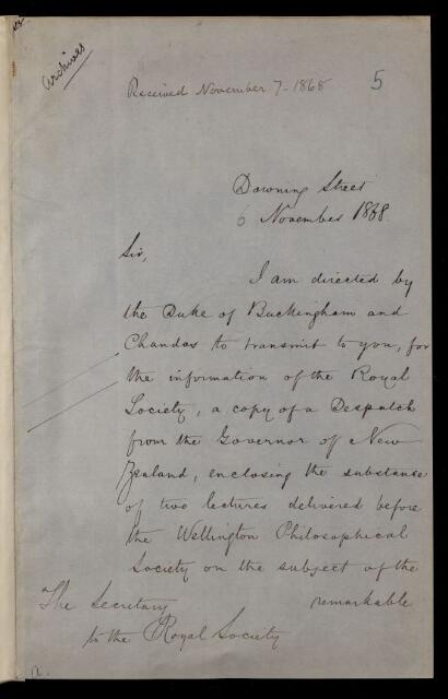 Bowen shares newspaper cuttings describing two lectures delivered by James Hector to the Wellington Philosophical Society on the topic of tidal disturbances and earthquakes experienced in New Zealand in August 1868. Bowen asks that details of the lectures be forwarded to the Royal Society. At the time, the Duke of Buckingham was the Secretary of the State for the Colonies. Preceded by a covering letter from Frederic Roger to the Secretary of the Royal Society, dated 6 November 1868.