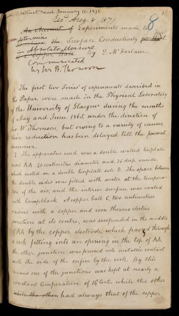 D MacFarlane, Unpublished paper, 'Experiments made to determine surface conductivity for heat in absolute measure' by D MacFarlane, 1871-1872, AP/54/8, The Royal Society Archives, London, https://makingscience.royalsociety.org/items/ap_54_8/unpublished-paper-experiments-made-to-determine-surface-conductivity-for-heat-in-absolute-measure-by-d-macfarlane, accessed on 16 January 2026