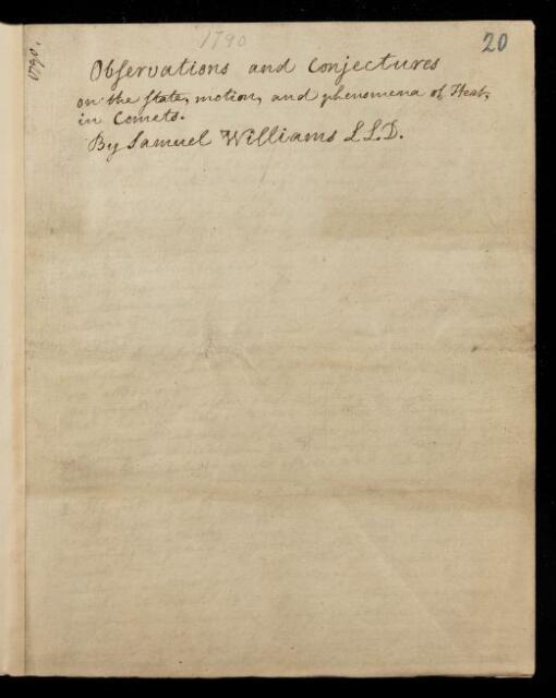 Unpublished paper, 'Observations and conjectures on the state, motion, and phenomena of heat, in comets' by Samuel Williams