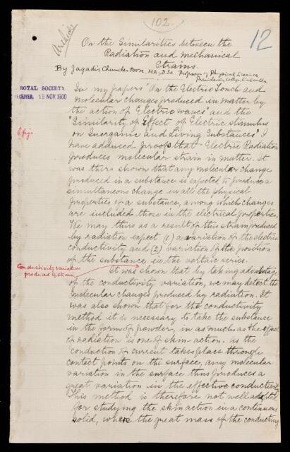 Jagadis Chunder Bose, Paper, 'On the similarities between the radiation and mechanical strains' by Jagadis Chunder Bose, 1900, AP/74/12, The Royal Society Archives, London, https://makingscience.royalsociety.org/items/ap_74_12/paper-on-the-similarities-between-the-radiation-and-mechanical-strains-by-jagadis-chunder-bose, accessed on 07 February 2026