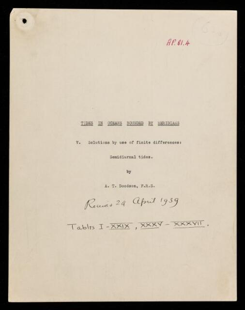 Arthur Thomas Doodson, Unpublished paper, 'Tides in oceans bounded by meridians' by A T [Arthur Thomas] Doodson, 1939, AP/81/4, The Royal Society Archives, London, https://makingscience.royalsociety.org/items/ap_81_4/unpublished-paper-tides-in-oceans-bounded-by-meridians-by-a-t-arthur-thomas-doodson, accessed on 09 December 2025