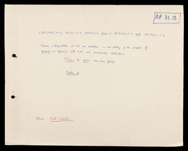 W N Lipscombe, G N Reeke, Jean A Hartsuck, F A Quiocho, P H Bethge, Supporting data, regarding 'The structure of carboxypeptidase A. VIII. Atomic interpretation at 0.2 nm resolution, a new study of the complex of glycyl-L-tyrosine with CPA, and mechanistic deductions' by W N Lipscomb, G N Reeke, Jean A Hartsuck, F A Quiocho and P H Bethge, 1970, AP/83/12, The Royal Society Archives, London, https://makingscience.royalsociety.org/items/ap_83_12/supporting-data-regarding-the-structure-of-carboxypeptidase-a-viii-atomic-interpretation-at-02-nm-resolution-a-new-study-of-the-complex-of-glycyl-l-tyrosine-with-cpa-and-mechanistic-deductions-by-w-n-lipscomb-g-n-reeke-jean-a-hartsuck-f-a-quiocho-and-p-h-bethge, accessed on 17 January 2026