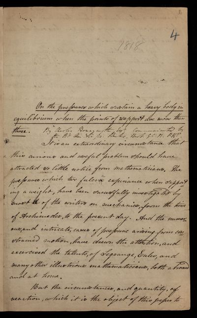 Unpublished paper, 'On the pressures which sustain a heavy body in equilibrium when the points of support are more than three' by Charles Bonnycastle