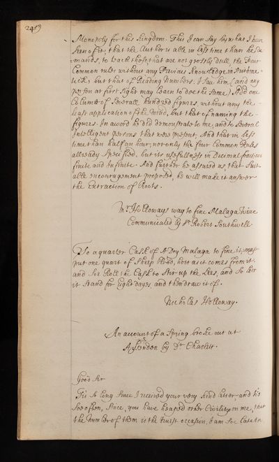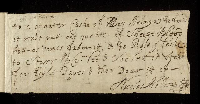Paper, how to fine Malaga wine by Nicholas Hollway [Holloway], 1698, CLP/10iii/38, The Royal Society Archives, London, https://makingscience.royalsociety.org/items/clp_10iii_38/paper-how-to-fine-malaga-wine-by-nicholas-hollway-holloway, accessed on 18 January 2026