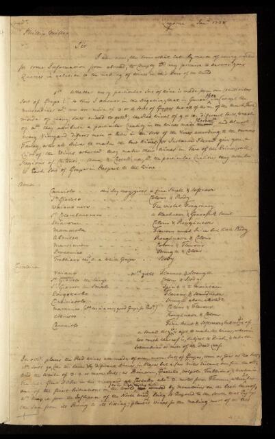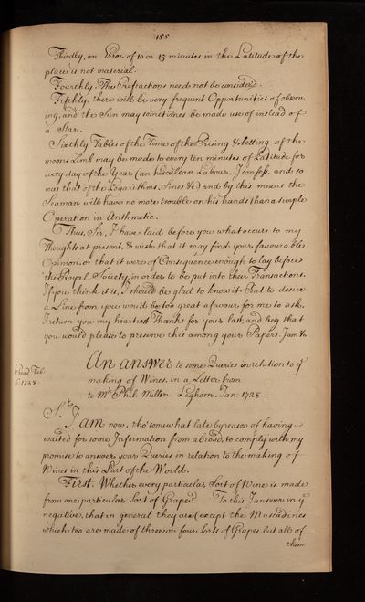 Paper, answers to queries about different types of wine in Italy in a letter to Philip Miller by unknown author, January 1728, CLP/10iii/44, The Royal Society Archives, London, https://makingscience.royalsociety.org/items/clp_10iii_44/paper-answers-to-queries-about-different-types-of-wine-in-italy-in-a-letter-to-philip-miller-by-unknown-author, accessed on 08 February 2026