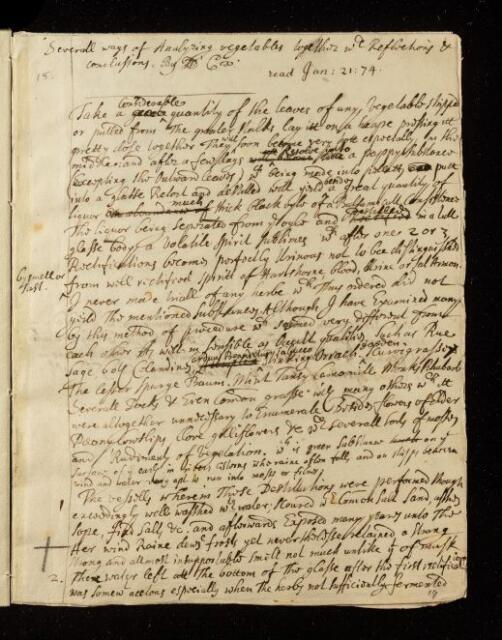 Daniel Coxe, Paper, 'Severall ways of analyzing vegetables together with reflections and conclusions' by Dr [Daniel] Cox [Coxe], 1674, CLP/11i/15, The Royal Society Archives, London, https://makingscience.royalsociety.org/items/clp_11i_15/paper-severall-ways-of-analyzing-vegetables-together-with-reflections-and-conclusions-by-dr-daniel-cox-coxe, accessed on 12 December 2025