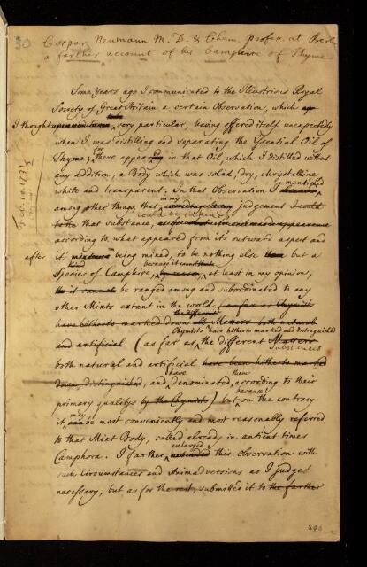 Caspar Neumann, Paper, 'A farther account of his camphire of thyme' by Caspar Neumann, 05 March 1731, CLP/11ii/30, The Royal Society Archives, London, https://makingscience.royalsociety.org/items/clp_11ii_30/paper-a-farther-account-of-his-camphire-of-thyme-by-caspar-neumann, accessed on 14 March 2026