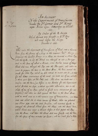 Edmond King, Paper, 'Account of the experiment of transfusion, made by Dr Lower and Dr King, upon Arthur Coga' by Dr [Edmond] King, 1667, CLP/12i/16, The Royal Society Archives, London, https://makingscience.royalsociety.org/items/clp_12i_16/paper-account-of-the-experiment-of-transfusion-made-by-dr-lower-and-dr-king-upon-arthur-coga-by-dr-edmond-king, accessed on 10 December 2025
