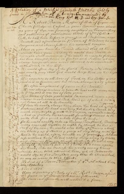 Edmond King, Paper, 'A relation of a petrified glandula pinealis lately found in the dissection of a brain' by Sir Edmond King, 06 November 1686, CLP/12i/29, The Royal Society Archives, London, https://makingscience.royalsociety.org/items/clp_12i_29/paper-a-relation-of-a-petrified-glandula-pinealis-lately-found-in-the-dissection-of-a-brain-by-sir-edmond-king, accessed on 11 March 2026