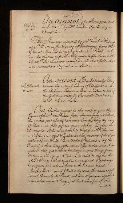 Note, regarding a stone extracted from a woman when she was in labour by unknown author, 1730, CLP/12ii/51, The Royal Society Archives, London, https://makingscience.royalsociety.org/items/clp_12ii_51/note-regarding-a-stone-extracted-from-a-woman-when-she-was-in-labour-by-unknown-author, accessed on 05 March 2026