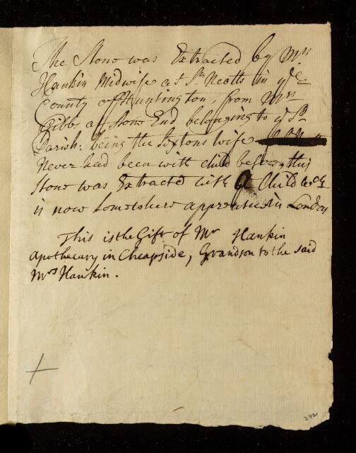 A note describing a stone extracted from a woman in labour by a midwife called Mrs Hankin in St Neotts [St Neots, Cambridgeshire, England]. The stone was sent to the Royal Society by Mr Hankin, apothecary and grandson of the midwife.