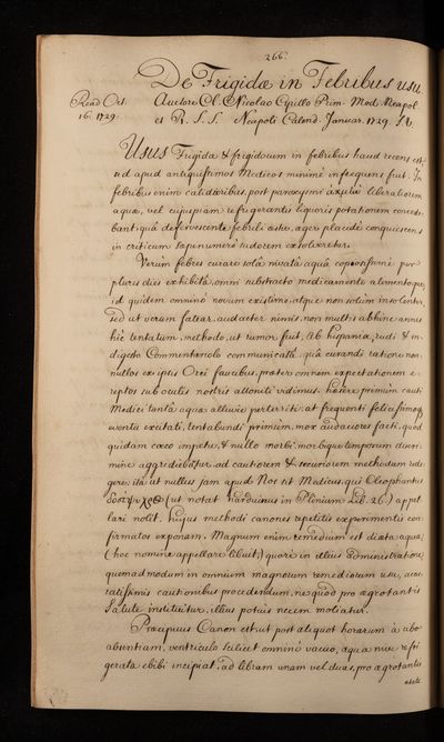 Paper, 'De Frigidae in Febribus usu' [Of the use of cold water in fevers] by Nicholas Cyrillus, January 1729, CLP/14ii/26, The Royal Society Archives, London, https://makingscience.royalsociety.org/items/clp_14ii_26/paper-de-frigidae-in-febribus-usu-of-the-use-of-cold-water-in-fevers-by-nicholas-cyrillus, accessed on 08 February 2026