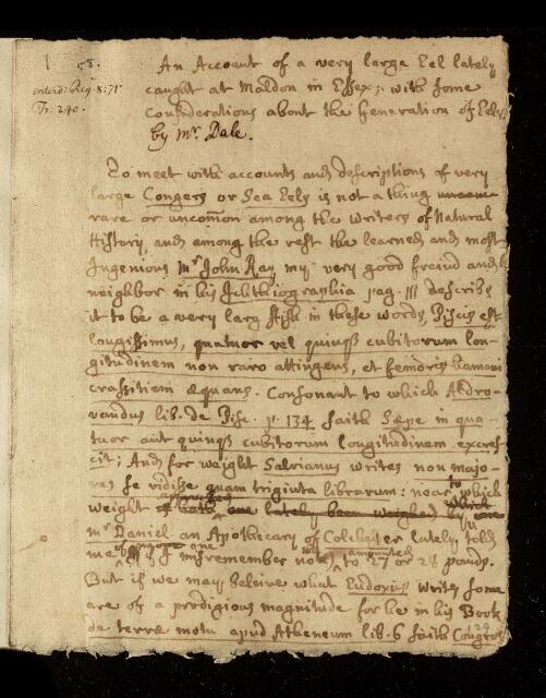Paper, 'An account of a very large eel lately caught at Maldon in Essex; with some considerations about the generation of eels' by Mr Dale, 1698-1699, CLP/15i/58, The Royal Society Archives, London, https://makingscience.royalsociety.org/items/clp_15i_58/paper-an-account-of-a-very-large-eel-lately-caught-at-maldon-in-essex-with-some-considerations-about-the-generation-of-eels-by-mr-dale, accessed on 14 April 2026