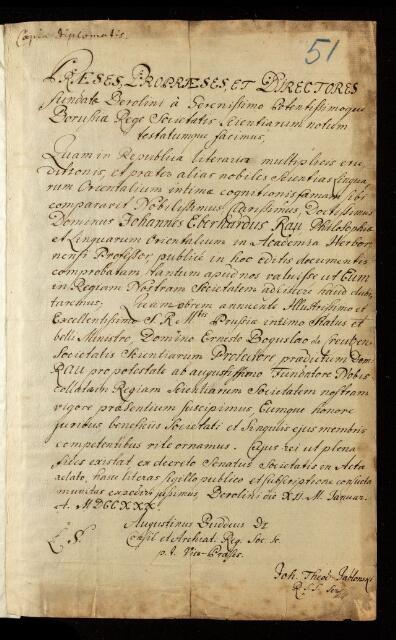 Copy of the diploma to the Fellowship of the Royal Academy of Berlin issued to J E Rau for oriental languages, 12 January 1730, CLP/17/51, The Royal Society Archives, London, https://makingscience.royalsociety.org/items/clp_17_51/copy-of-the-diploma-to-the-fellowship-of-the-royal-academy-of-berlin-issued-to-j-e-rau-for-oriental-languages, accessed on 11 November 2025