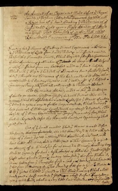 Paper, 'An account of an experiment made before the Royal Society at Gresham College, October the 23rd 1706, together with a repetition of the same, touching the production of a considerable light upon a slight attrition of the hands on a glass globe exhausted of its air: with other remarkable occurrances' by Francis Hauksbee
