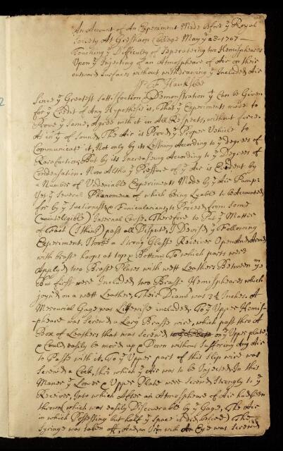 Francis Hauksbee, Paper, account of an experiment on the difficulty of separating two hemispheres upon the injection of an atmosphere of air on their outward surfaces without withdrawing the internal air by Francis Hauksbee, 1707, CLP/18i/112, The Royal Society Archives, London, https://makingscience.royalsociety.org/items/clp_18i_112/paper-account-of-an-experiment-on-the-difficulty-of-separating-two-hemispheres-upon-the-injection-of-an-atmosphere-of-air-on-their-outward-surfaces-without-withdrawing-the-internal-air-by-francis-hauksbee, accessed on 12 December 2025
