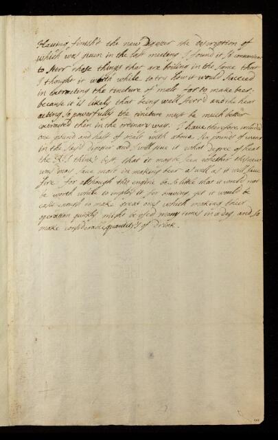 Account of experiment conducted at the Royal Society with the new digester, to brew beer using malt and water, heating up the digester once the mixture under pressure. Suggests different temperatures could be try and that the method could economise use of malt. Notes that the current digester is too small to produce required quantities of beer, but that a larger one would be easy to make for larger production.