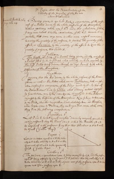 Denis Papin, Paper, regarding velocity of the air in bullet firing by Denis Papin, 1687, CLP/18i/60, The Royal Society Archives, London, https://makingscience.royalsociety.org/items/clp_18i_60/paper-regarding-velocity-of-the-air-in-bullet-firing-by-denis-papin, accessed on 12 March 2026
