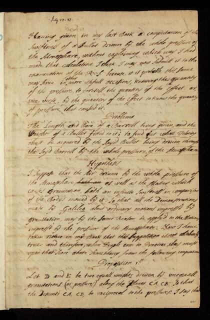 Papin states that previously he had given a computation of the swiftness of a bullet driven by the whole pressure of the atmosphere without explaining the calculation, and wishes to rectify this. He presents the problem: 'The length and bore of a barrell being given, and the weight of a bullet fitted to it; to find out, what velocity must be acquired by the sayd bullet being driven through the sayd barrill by the whole pressure of the atmosphere.' He shares his hypothesis, two propositions and three corollaries.