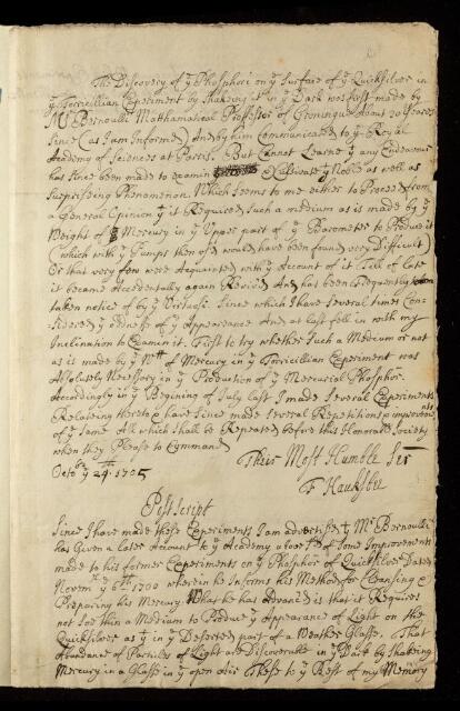 Francis Hauksbee, Paper, regarding Bernoulli's discovery of phosphorus on the surface of quicksilver in the Torricellian experiment by Francis Hauksbee, 24 October 1705, CLP/18i/89, The Royal Society Archives, London, https://makingscience.royalsociety.org/items/clp_18i_89/paper-regarding-bernoullis-discovery-of-phosphorus-on-the-surface-of-quicksilver-in-the-torricellian-experiment-by-francis-hauksbee, accessed on 14 January 2026