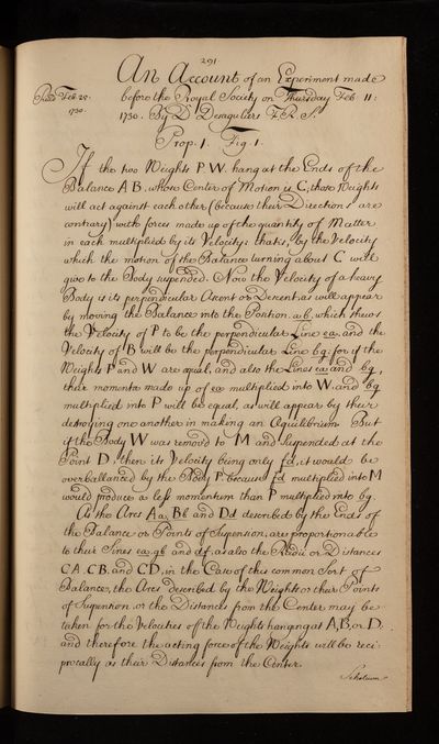 Paper, Account of an experiment explaining a mechanical paradox by J T [John Theophilus] Desaguliers, 1731, CLP/18ii/33, The Royal Society Archives, London, https://makingscience.royalsociety.org/items/clp_18ii_33/paper-account-of-an-experiment-explaining-a-mechanical-paradox-by-j-t-john-theophilus-desaguliers, accessed on 23 January 2026