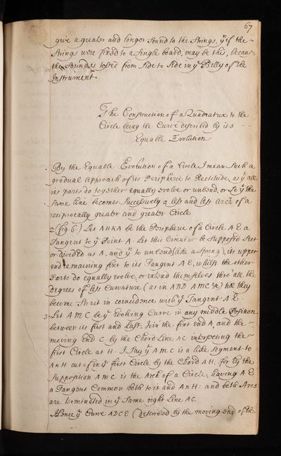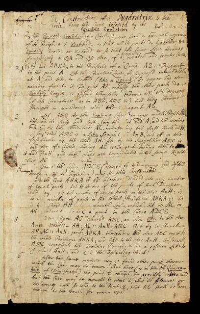 Paper, 'The construction of a quadratrix to the circle, being the curve describd by its equable evolution' by unknown author, 1701, CLP/1/32, The Royal Society Archives, London, https://makingscience.royalsociety.org/items/clp_1_32/paper-the-construction-of-a-quadratrix-to-the-circle-being-the-curve-describd-by-its-equable-evolution-by-unknown-author, accessed on 11 December 2025
