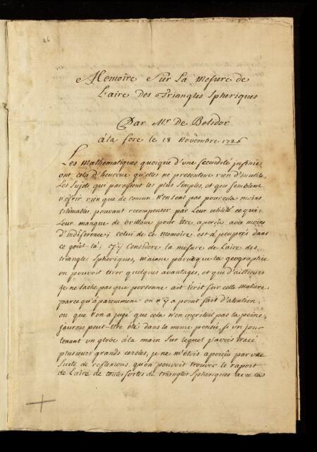 Bernard Forest de Belidor, Paper, 'Mémoire sur la mesure de l'aire des triangles sphériques' ['On measuring the area of spherical triangles'] by Mr [Bernard Forest] de Belidor, 18 November 1726, CLP/1/46, The Royal Society Archives, London, https://makingscience.royalsociety.org/items/clp_1_46/paper-mémoire-sur-la-mesure-de-laire-des-triangles-sphériques-on-measuring-the-area-of-spherical-triangles-by-mr-bernard-forest-de-belidor, accessed on 09 March 2026