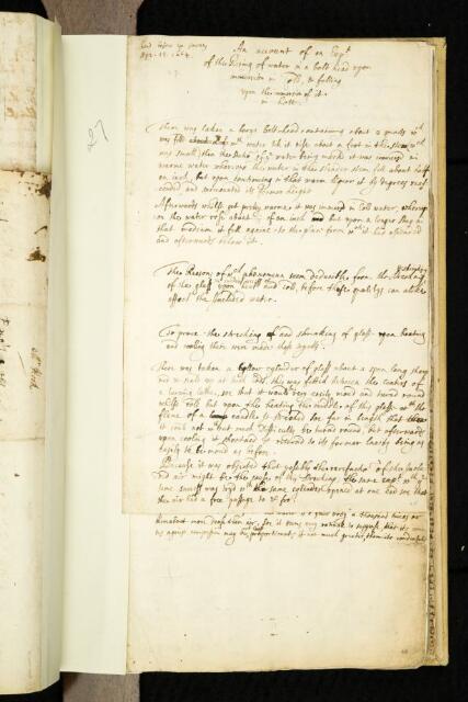 Robert Hooke, Paper, 'An account of an experiment of the rising of water in a bolt head upon immersion in cold, & falling upon the immersion of it in hot' by Robert Hooke, 13 April 1664, CLP/20/27, The Royal Society Archives, London, https://makingscience.royalsociety.org/items/clp_20_27/paper-an-account-of-an-experiment-of-the-rising-of-water-in-a-bolt-head-upon-immersion-in-cold-falling-upon-the-immersion-of-it-in-hot-by-robert-hooke, accessed on 07 November 2025