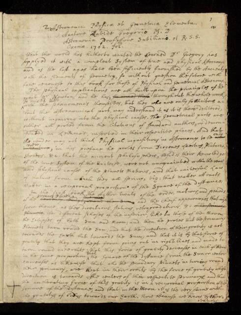 David Gregory, Paper, Account of 'Astronomiae physicae et geometricae elementa [Of the physical and geometrical elements of astronomy]' by David Gregory, 1703, CLP/22i/61, The Royal Society Archives, London, https://makingscience.royalsociety.org/items/clp_22i_61/paper-account-of-astronomiae-physicae-et-geometricae-elementa-of-the-physical-and-geometrical-elements-of-astronomy-by-david-gregory, accessed on 12 March 2026