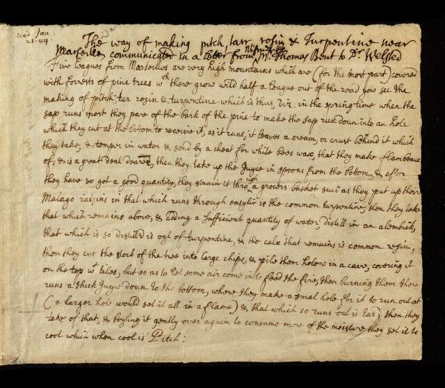 Extract of a letter, 'The way of making pitch, tarr, rosin and turpentine near Marseilles' in a letter from Thomas Bent to Dr Welsted, 1684, CLP/3i/23a, The Royal Society Archives, London, https://makingscience.royalsociety.org/items/clp_3i_23a/extract-of-a-letter-the-way-of-making-pitch-tarr-rosin-and-turpentine-near-marseilles-in-a-letter-from-thomas-bent-to-dr-welsted, accessed on 17 March 2026