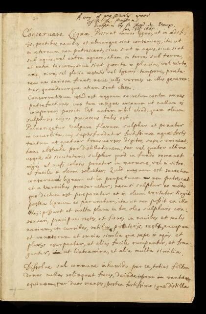 Paper, 'A way of preserving wood' by Th [Théodore de] Mayerne, 1665, CLP/3i/24, The Royal Society Archives, London, https://makingscience.royalsociety.org/items/clp_3i_24/paper-a-way-of-preserving-wood-by-th-théodore-de-mayerne, accessed on 14 April 2026